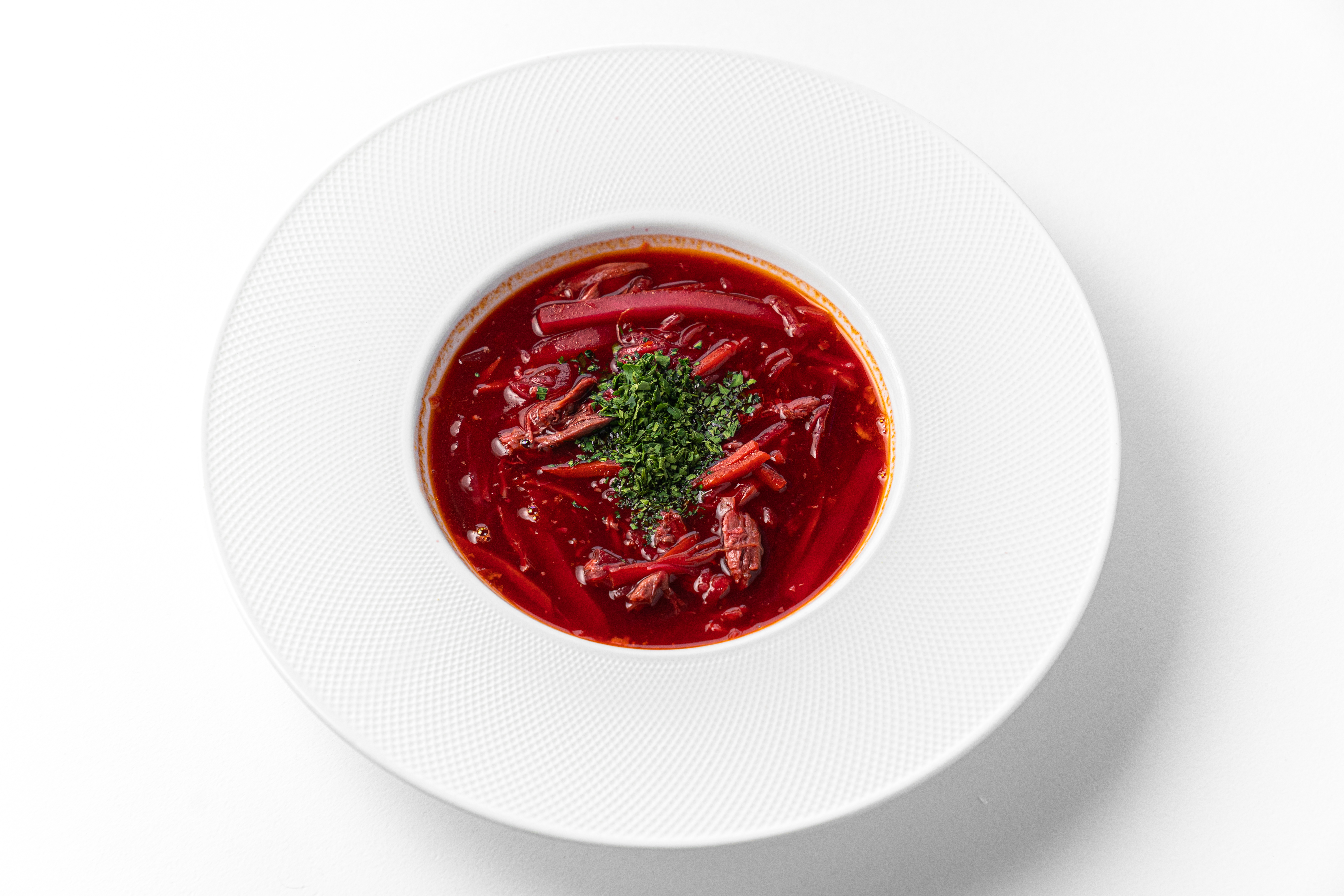 Борщ, в котором последняя ложка нисколько не скучнее первой. В наваристом мясном бульоне – внушительные брусочки утиного мяса и овощей. Запечённая со специями свекла делает этот борщ по-настоящему сложным и мощным. Блюдо подается с зеленью и сметаной.
