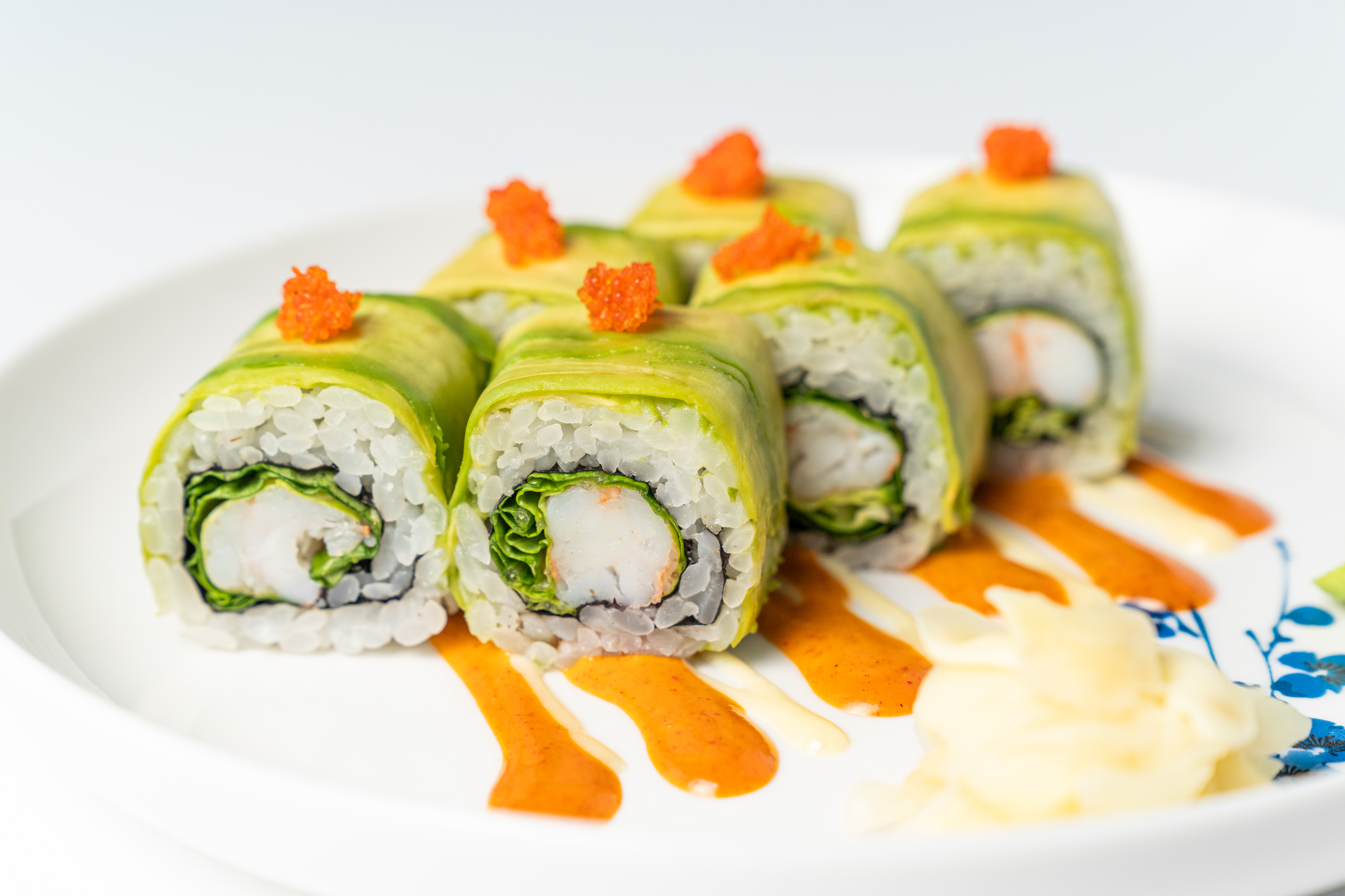 Красная аргентинская креветка в сочетании с авокадо и икрой тобико являет собой квинтэссенцию гастрономического наслаждения.