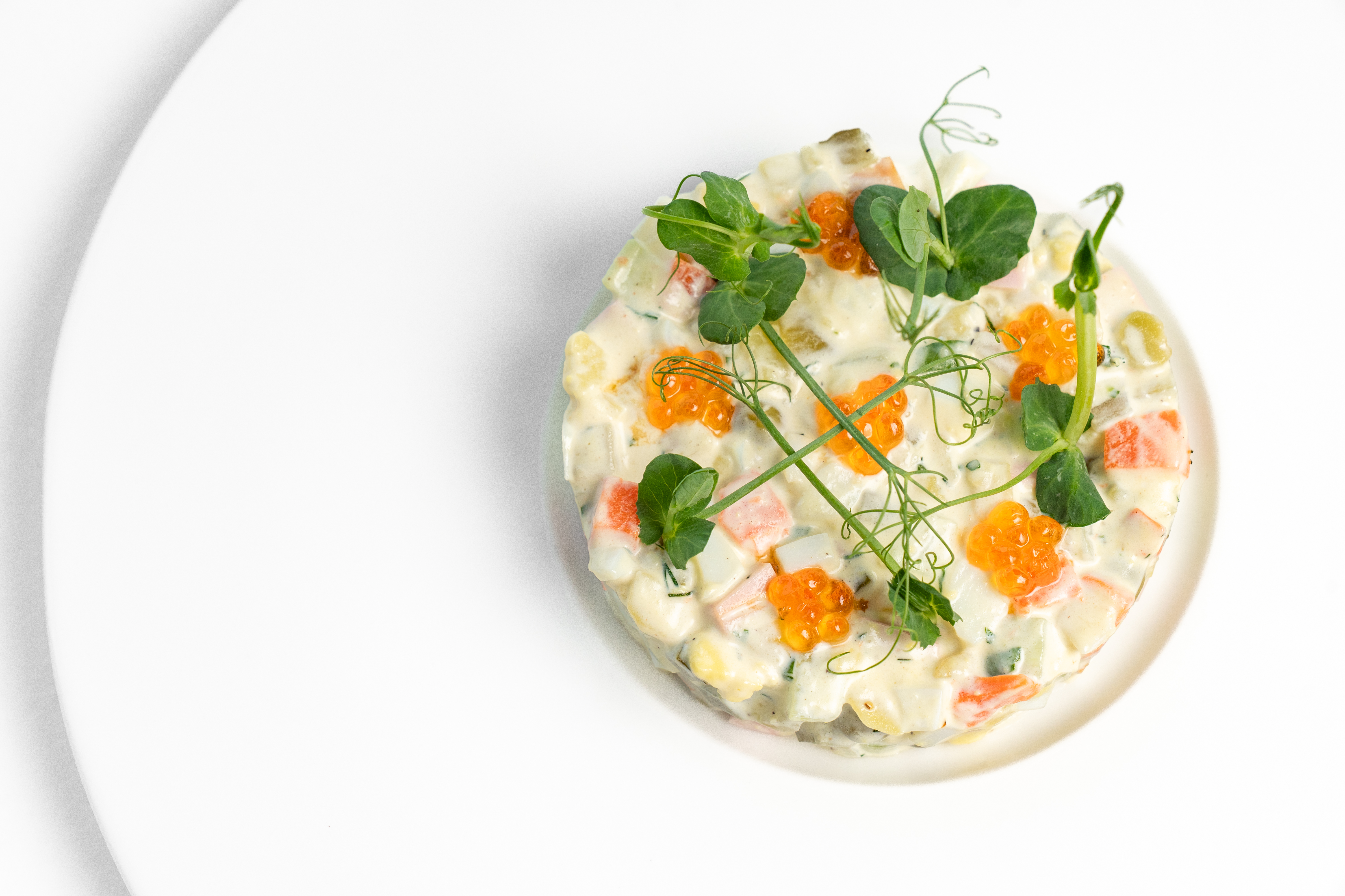 Фирменный рецепт, в который добавляется японский майонез, копчёный лосось, немного хрена. Подаётся с гречишными чипсами и креветками, маринованными в белом вине.